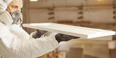 D&J takes steps to protect your home. Doors and drawers are removed and taken to a D&J paint location off property! Base/boxes are painted in place. Prep includes cleaning, repairs, reconditioning of cabinets, grain fill if requested, drill/fill holes for knobs/handles, caulking where necessary, prime and coat!